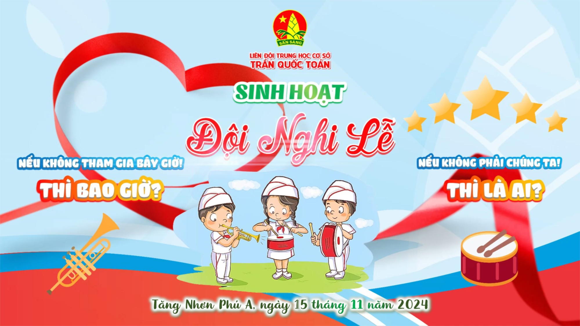 Liên đội tổ chức sinh hoạt đội trống kèn và đội cờ, đội nghi lễ hàng tuần theo kế hoạch xuyên suốt năm học 2024 - 2025. Tháng 11 các bạn hoàn thiện kỹ năng thực hiện bài kèn "Chào mừng, Quốc ca, Đội ca"